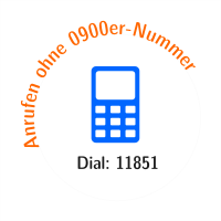 Die Kosten von 1,99 €/Min. (inkl. MwSt. aus dem deutschen Festnetz, Mobilfunk abweichend) beziehen sich auf die Einwahl auf den 11851* Auskunftsdienst. Die Kosten für den Mehrwertdienst nach der Weitervermittlung betragen auch 1,99 €/Min. (inkl. MwSt. aus dem deutschen Festnetz, Mobilfunk abweichend)