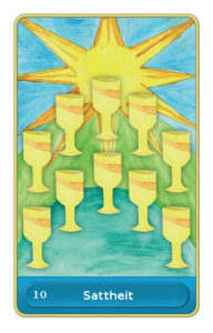 Eine Frau und ein Mann stehen umarmt und die Arme in den Himmel erhoben vor einer grünen Landschaft, mit einem Haus und einem Fluss oder See. Zwei Kinder halten sich an den Händen und tanzen sehr fröhlich miteinander. Über diesem wunderschön anmutenden Bild sieht man einen Regenbogen, gefüllt mit 10 Kelchen, die im Licht strahlen. Auch die Kleider der Menschen auf der Karte zeigen den Einklang. Sie ist bei allen in rot und blau gehalten. Die rote Farbe steht für die Energie und die blaue für das Wasser. Die Energie fließt also wieder im Gleichmaß.